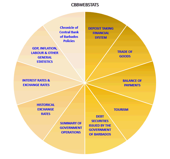 Welcome to the Statistics page of the Central Bank of Barbados, housing a wealth of statistical information compiled from original and secondary sources across the various sectors of the economy. CBBWEBSTATS are a series of webpages fully integrated with the Bank’s official website and offering a more seamless and intuitive experience than its predecessors 1 . The data can be downloaded in Excel format through a series of pre-formatted tables. The pages inherit the functionality of the overall website, allowing for an ability to search the Statistics pages. Further, each release/update is reflected in the Bank’s “Statistics News”. The Terms of Use of CBBWEBSTATS are reflected below, please be sure to review the same. All queries related to CBBWEBSTATS should be sent to statistics@centralbank.org.bb.